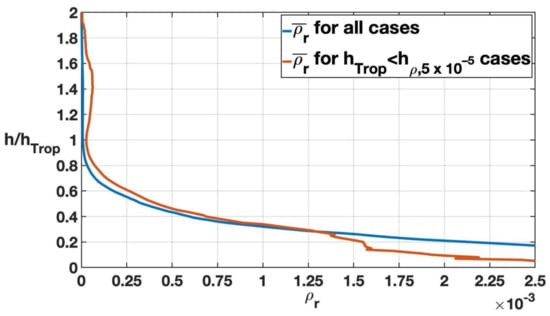 Turning back to water vapor concentrations in the stratosphere, in Figure 18, we plot both the mean mixing ratio vertical profile (blue, identical to that of Figure 3) then the conditioned mean mixing ratio vertical profile (red), the latter by selecting only those profiles for which . The altitudes are scaled with respect to the tropopause height. As one can see, the mixing ratio behavior in the case of  is more complex than the general one: we expect to find dry air starting altitudes above ~1.6 , together with a dry air window around the tropopause, where humidity concentration reaches a minimum, while the wet stratosphere is mainly concentrated between 1.2 ÷ 1.6 . Besides, observe that below ~0.3, the tropopause altitude air with stratospheric water vapor is mainly drier, with respect to the general case.