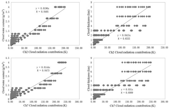 (4) Cloud parameter inversion of a single channel. The theoretical relationship for the inversion is nonlinear, as shown by Equation (9a), and the scatterplots from the simulation to show the dependencies of cloud radiation contribution on cloud water content and cloud thickness are in Figure 1. Though a quadratic or cubic function would be better to obtain the best fitting according to the scatterplots of Figure 1, a linear function for simplicity has been used to obtain the regression model for inversing cloud water concentration and cloud thickness (denoted as and ) from of channel 2, 7 and 10: