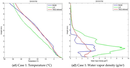 The first two cases are typical for early winter in Beijing, where the surface air temperature is about 10 °C and the humidity is around 5 g/m3. There exists a layer of stratus or stratocumulus at the level of 2–3 km. The cloud layer may be revealed by RAOB because the humidity inside the cloud is larger than the outside but the temperature decreases smoothly as height increases in the troposphere. The features above are shown well by the blue lines for RAOB in Figure 4a,b. The two cases differ in time by 24 h, but look similar, implying that the information from RAOB is reliable. The temperature profiles (red line in Figure 4(a1,b1)) are obviously closer to the RAOB than the LV2, especially above 2 km where agreement is particularly strong. The water vapor density profiles (red line in Figure 4(a2,b2)), although different from the RAOB, is in better agreement with the RAOB than the LV2, which led the water vapor density overestimated up to 10 g/m3, as compared to the truth of 4–5 g/m3.