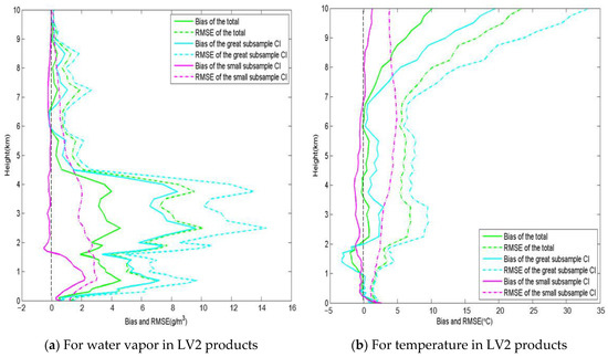 The upper two sub-panels in Figure 5 are for the accuracy of water vapor density (Figure 5a) and temperature (Figure 5b) in the vendor- provided LV2 products. Green lines, as shown before in Figure 3, represent the LV2 ensemble accuracy of the total 109 cloudy cases. However, the cyan lines represent the subsample accuracy for high-CI cases, while the magenta lines represent the subsample accuracy for low-CI cases. One can see that both BIAS and RMSE of “high-CI subsample” are larger than those of “low-CI subsample”, indicating that high-CI cloud has a higher impact on the retrieved results and cloud correction is more necessary.