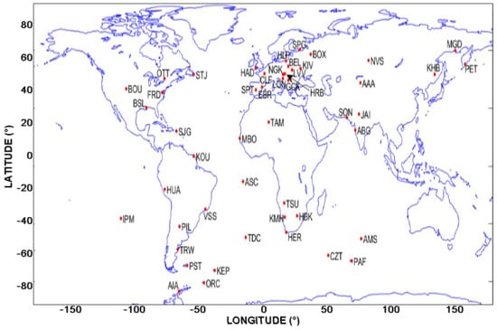 World map with locations of the INTERMAGNET geomagnetic observatories.
