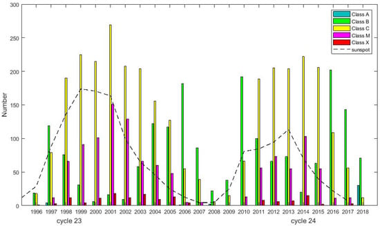 Variation of solar flare occurrence during solar cycles 23 and 24. A-class (blue), B-class (Green), C-class (yellow), M-class (Violet) and X-class (Red). The dotted line represents the sunspots number observed on the sun’s surface from 1996 to 2018.