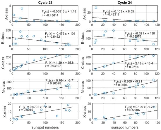 - The negative correlation between A and B-class flare and sunspot numbers (−0.43/−0.54 and −0.42/−0.39) during SC23/24 was related to the frequent occurrence of such classes of flare during solar minimum.