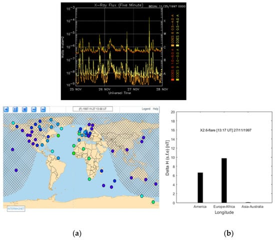 X-ray flux of X2.6 solar flare of 27 November 1997 (www.speaceweather.com/archive.php, accessed on 1 November 2021). The illuminated part of the Earth during this solar flare of 27 November 1997, is shown in Figure 4, with noon in UT closer to Europe-Africa longitude sector (on top) and below. Day and night alternation Source INTERMAGNET (a) and histograms of the average variations of magnetic crochets in South and North America, Europe-Africa and Asia-Australia longitude sectors from 11 November 1997 at 13:17 UT (b).