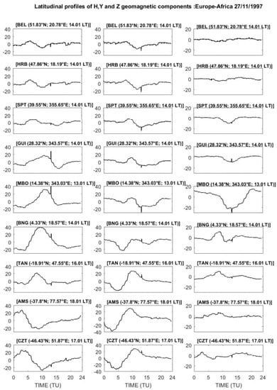 Latitude variation of horizontal (H), eastward (Y), and vertical (Z) components of the geomagnetic field during the X2.6 solar flare of 27 November 1997.