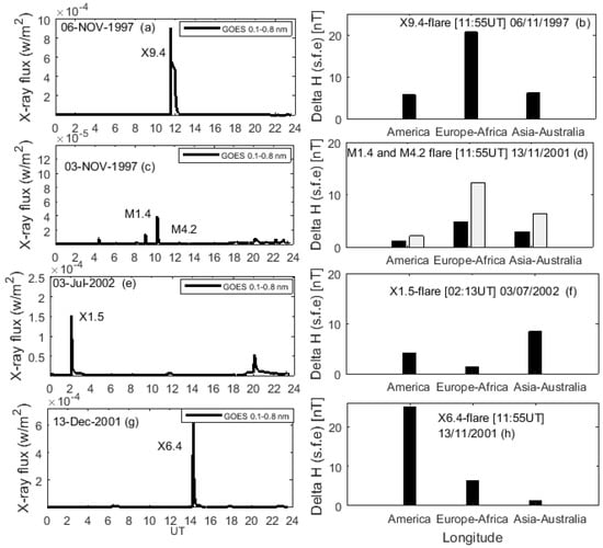 X-ray flux and histograms of the average variations of magnetic crochets in South and North America, Europe-Africa and Asia-Australia longitude sectors for X9.4 solar flare of 6 November 1997, M1.4 and M4.2 solar flares of 3 November 1997, X1.5 solar flare of 3 July 2002, X6.4 solar flare of 13 December 2001, and X1.7 and X2.1 solar flares of 25 October 2013. (a,b) show respectively X-ray flux and mean variation of Hsfe for X9.4, (c,d) show respectively X-ray flux and mean Hsfe for M1.4 and M4.2, (e,f) show respectively X-ray flux and mean Hsfe for X1.5, then (g,h) show respectively X-ray flux and mean Hsfe for X6.4.