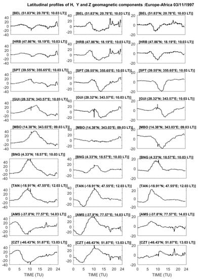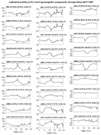 The latitudinal variation of the magnetic response to the X2.6 solar flare is shown in Figure 5. This figure deals with the diurnal variation of the horizontal (H), eastward (Y) and vertical (Z) components of the Earth’s geomagnetic field on 27 November 1997, at stations located in the Europe-Africa longitude. At the MBO station, H suddenly increased and reached a maximum at approximately 13:19 LT. It then dropped and returned to its normal variation at approximately 13:23 LT. The sudden increase in H was observed simultaneously at all stations, but its amplitude differed from one station to the other. For example, it decreased from the stations located close to the magnetic equator to those at the boundaries of the northern and southern hemispheres. The magnetic signature of the flare (ΔHsfe) otherwise known as the magnetic crochet was positive at low latitudes and negative at mid-latitudes. For the X2.6 solar flare, the maximum value of the magnetic crochet was recorded at MBO (ΔHsfe = 24.21 nT) rather than BNG (ΔHsfe = 9.64 nT) which is closer to the magnetic equator. The corresponding local time of occurrence of the peak solar flare effect was 14:01 LT at the BNG station. For the Eastward component (Y), the magnetic response associated with the November 27, 1997, flare manifested in the form of a negative crochet in the Northern Hemisphere and positive crochet in the Southern Hemisphere. The amplitude reversal occurred between the equatorial stations MBO and BNG. The maximum values of sfe were observed at MBO, were ΔYsfe = 13.5 nT at 13:19 LT and ΔYsfe = −6.3 nT at BNG.