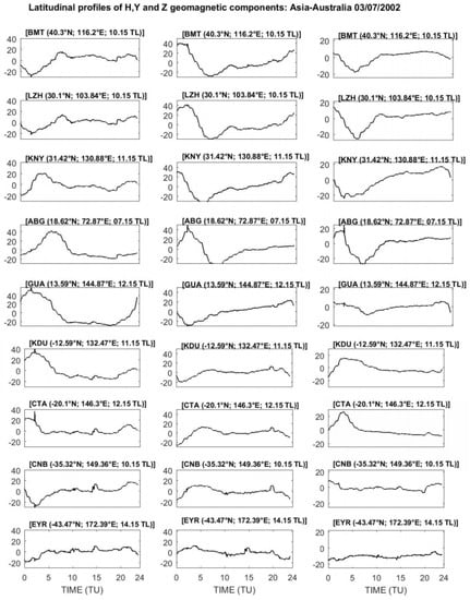The perturbation on the geomagnetic components associated with the X1.5-class solar flare of 3 July 2002 is shown in Figure 9. The H component had similar variation to the one observed on 27 November 1997. However, the inversions of the amplitudes of the magnetic crochets occurred between the low latitude and mid-latitude.