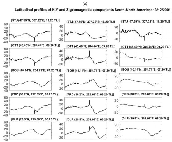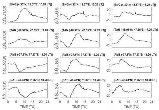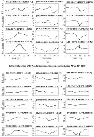 Figure 10a,b shows the sfe on the geomagnetic H, Y and Z components recorded in the South America and Europe-Africa longitudes. The magnetic equator in the South America sector was located around the SJG and KOU, while it was located between MBO and BNG for the African longitude. The sfe on the H component was always reversed between the mid and low-latitudes in both sectors, with a difference in the magnitude of the magnetic crochets. The amplitudes of the Magnetic crochets were greater in the America than Europe-Africa sector. At VSS, the peak ΔHsfe was 66.65 nT at 11:20 LT in the American sector and 14.01 nT at 14:20 LT in MBO for the Europe-African sector.