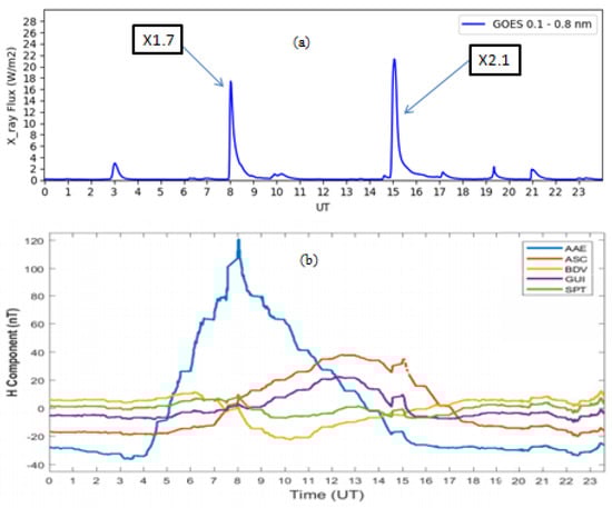 (a) Magnetic effects of the X1.7 and X2.1 solar flares of 25 October 2013, and (b) on the H component at different observatories.