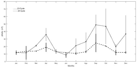 Figure 12 shows the monthly variation of sfe observed during cycles 23 and 24. The dot (bold) lines represent the monthly average values derived during solar cycle 23 (cycle 24). The error bars are the standard deviations, and the solid curves are the average variations of the sfe. The long error bars indicate that these measurements have a large variability and thus the mean value may not be very relevant. Thus, the results on seasonal variability and even those on cycle comparison should be taken with caution. We noticed in this figure that both curves have similar pattern, with peaks occurring at the same time, except during February and June, where there is a different growth in both cycles. We observe that, the solar flares effects are stronger during March equinox (February-March-April) and September equinox (August-September-October), and weak during June solstice (May-June-July) and December Solstice (November-December-January). On the average, the sfes were stronger in the cycle 23 than the cycle 24. The highest sfe value was recorded in September during both cycles with ΔHsfe = 48.82 nT for cycle 23 and ΔHsfe = 24.68 nT for cycle 24. Conversely, the lowest values of the sfe were registered in June for cycle 23 (ΔHsfe = 8.69 nT) and July for cycle 24 (ΔHsfe = 10.69 nT).