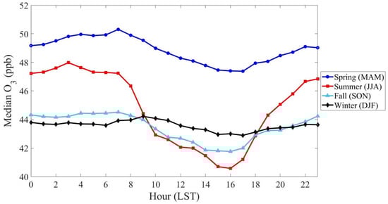 Figure 1 shows the diurnal variability in median O3 concentrations for each season. Consistent with previous studies conducted at MBO [,,], we generally see a daytime minimum and nighttime maximum in O3 due to upslope flow during the day and downslope flow at night. This influenced how we chose to average the data, as discussed below.