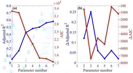 (a) Magnitude of adjusted R2 and AIC with additional variables for MBO from 2006–2020. (b) Changes in adjusted R2 and AIC with additional variables for MBO from 2006–2020. See Table 1 for the parameter names corresponding to the parameter numbers.