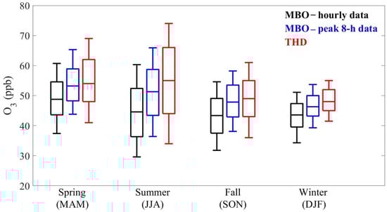 The seasonal variability in O3 concentrations at MBO and THD (680–780 hPa) is shown in Figure 3. Median O3 levels at MBO using all data ranged from 43 ppb in fall to 49 ppb in spring, median peak 8 h O3 levels at MBO ranged from 46 ppb in winter to 53 ppb in spring, and median O3 levels at THD ranged from 48 ppb in winter to 55 ppb in summer. These values are (1) in line with mean baseline O3 concentrations of approximately 50 ppb reported for 15 other high-elevation sites in the WUS [] and (2) about 61–79% of the 70 ppb O3 NAAQS. The slightly lower seasonal concentrations of hourly O3 at MBO were likely attributable to daytime upslope flow of boundary-layer air containing more moisture and less O3 compared to free tropospheric air. Meanwhile, the comparable seasonal values of peak 8 h O3 at MBO and O3 at THD suggest that the two sites are affected by similar airmasses.