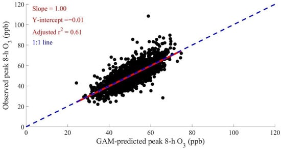 Observed versus GAM-predicted peak 8 h O3 at MBO from 2006–2020. The solid red line and the dashed blue line are the trendline and 1:1 line, respectively.
