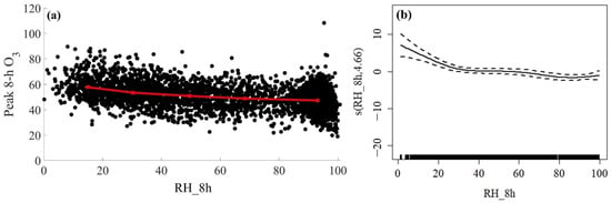 Figure 4 compares the observed versus GAM-predicted peak 8 h O3 at MBO from 2006–2020. Our model effectively predicted peak 8 h O3, with an adjusted R2 of 0.61. All seven predictive variables had a statistically significant impact on peak 8 h O3 levels (p < 0.05). The effects of RH, WV mixing ratio, aerosol scattering, CO, and daily regional tropopause pressure on peak 8 h O3 are shown in Figure 5, Figure 6, Figure 7, Figure 8 and Figure 9. Peak 8 h O3 generally decreased with increasing RH and WV mixing ratio (Figure 5 and Figure 6). Since MBO is in a rural, NOx-sensitive environment, these relationships are likely due to increased removal of O3 by hydrogen oxide radicals (HOx = hydroxyl radical (OH) + hydroperoxyl radical (HO2)) at higher RH and WV mixing ratios []. Aerosol scattering and CO values up to approximately 30 Mm−1 and 300 ppb, respectively, had a positive relationship with peak 8 h O3 (Figure 7 and Figure 8). This is consistent with higher levels of aerosol scattering, CO, O3, and O3 precursors in more polluted airmasses. The response of peak 8 h O3 to aerosol scattering and CO values greater than about 30 Mm−1 and 300 ppb, respectively, is less clear because such high values are infrequently observed at MBO (see x-axes for Figure 7b and Figure 8b). This led to the large model uncertainty at very high aerosol scattering and CO values. As shown in Figure 9, peak 8 h O3 concentrations at MBO slightly decreased with increasing daily regional tropopause pressure. This is likely due to the lesser influence of free tropospheric air containing less moisture and more O3 when daily regional tropopause pressure is higher.