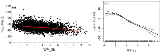 (a) Observed peak 8 h O3 (ppb) versus observed 8 h average WV mixing ratio (g kg−1) at MBO from 2006–2020. The black dots show the individual data points, and the connected red squares show the median peak 8 h O3 concentration, binned by 8 h average WV mixing ratio. The red squares are centered on the median 8 h average WV mixing ratio and the median peak 8 h O3 concentration for each bin. (b) Partial response plot showing the effect of 8 h average WV mixing ratio (g kg−1) on model-predicted peak 8 h O3 at MBO from 2006–2020. The tick marks on the x-axis denote the density of observed 8 h average WV mixing ratios. The spline smoothing function for 8 h average WV mixing ratio is on the y-axis, with the label including its degrees of freedom (4.86). The solid line shows the smooth curve, and the dashed lines indicate 2 standard error bounds.