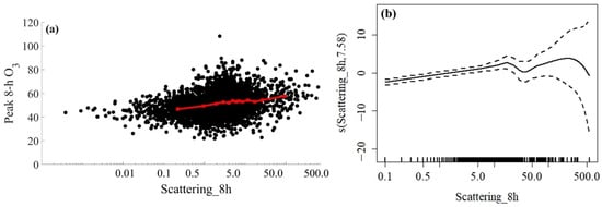 (a) Observed peak 8 h O3 (ppb) versus observed 8 h average aerosol scattering (Mm−1) at MBO from 2006–2020. The black dots show the individual data points, and the connected red squares show the median peak 8 h O3 concentration, binned by 8 h average aerosol scattering. The red squares are centered on the median 8 h average aerosol scattering value and the median peak 8 h O3 concentration for each bin. (b) Partial response plot showing the effect of 8 h average aerosol scattering (Mm−1) on model-predicted peak 8 h O3 at MBO from 2006–2020. The tick marks on the x-axis denote the density of observed 8 h average aerosol scattering values. The spline smoothing function for 8 h average aerosol scattering is on the y-axis, with the label including its degrees of freedom (7.58). The solid line shows the smooth curve, and the dashed lines indicate 2 standard error bounds. Note that the x-axes for panels (a) and (b) are plotted on a logarithmic scale.