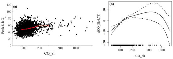 (a) Observed peak 8 h O3 (ppb) versus observed 8 h average CO (ppb) at MBO from 2006–2020. The black dots show the individual data points, and the connected red squares show the median peak 8 h O3 concentration, binned by 8 h average CO. The red squares are centered on the median 8 h average CO concentration and the median peak 8 h O3 concentration for each bin. (b) Partial response plot showing the effect of 8 h average CO (ppb) on model-predicted peak 8 h O3 at MBO from 2006–2020. The tick marks on the x-axis denote the density of observed 8 h average CO concentrations. The spline smoothing function for 8 h average CO is on the y-axis, with the label including its degrees of freedom (6.74). The solid line shows the smooth curve, and the dashed lines indicate 2 standard error bounds. Note that the x-axes for panels (a) and (b) are plotted on a logarithmic scale.