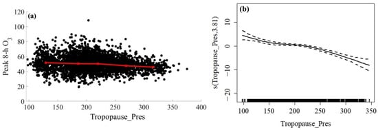 (a) Observed peak 8 h O3 (ppb) versus observed daily regional tropopause pressure (hPa) for MBO from 2006–2020. The black dots show the individual data points, and the connected red squares show the median peak 8 h O3 concentration, binned by daily regional tropopause pressure. The red squares are centered on the median daily regional tropopause pressure and the median peak 8 h O3 concentration for each bin. (b) Partial response plot showing the effect of daily regional tropopause pressure (hPa) on model-predicted peak 8 h O3 at MBO from 2006–2020. The tick marks on the x-axis denote the density of observed daily regional tropopause pressure values. The spline smoothing function for daily regional tropopause pressure is on the y-axis, with the label including its degrees of freedom (3.81). The solid line shows the smooth curve, and the dashed lines indicate 2 standard error bounds.