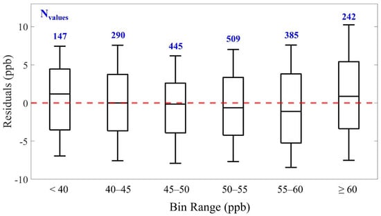 Residuals (observed peak 8 h O3 − GAM-predicted peak 8 h O3) at MBO from 2006–2020, binned by GAM-predicted peak 8 h O3 concentrations. The dashed red line denotes 100% agreement between observed and GAM-predicted peak 8 h O3 (i.e., residuals = 0 ppb). The components of each boxplot have the same meanings as in Figure 3.