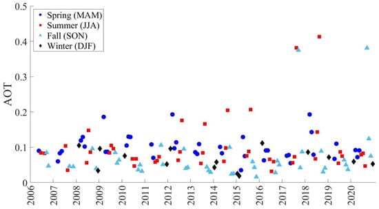 Monthly aerosol optical thickness (AOT) at MBO from 2006–2020. AOT data with 1° resolution were taken from the MODIS Aqua satellite.