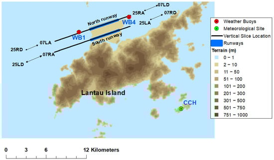 Figure 1 shows the Hong Kong International Airport study location, with the north and south runways and all runway corridors indicated. Both runways are 3.8 km in length and allow for planes arriving and departing in both directions. The runway-corridor naming convention is such that when landings and departures take place from the southwest to the northeast, the runway is named “07”, corresponding to a runway alignment of 70° as measured clockwise from the north; conversely, landings and departures from the northeast to the southwest are named “25”, corresponding to 250°. The northerly and southerly runways are categorized as either right (R) or left (L) relative to the direction of travel, and additionally as either approach (A) or departures (D). In order to model the wind shear experienced by aircraft during landing and take-off events, this study involved air-flow calculations on vertical grids of output points aligned with the runways; the ground-level signatures of these vertical grids are indicated by black lines in Figure 1. The location of the wind profiler at Cheung Chau, which provides near-real-time meteorological measurements for input into the now-casting system, is indicated (CCH), although the location of the microwave radiometer at King’s Park is beyond the extent of this map (25 km east of the airport).