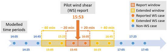 Example assignment of wind-shear event time (upper value, 15:53) to modelling period (lower values, 05, 25, and 45 past the hour), with reported and extended time windows.
