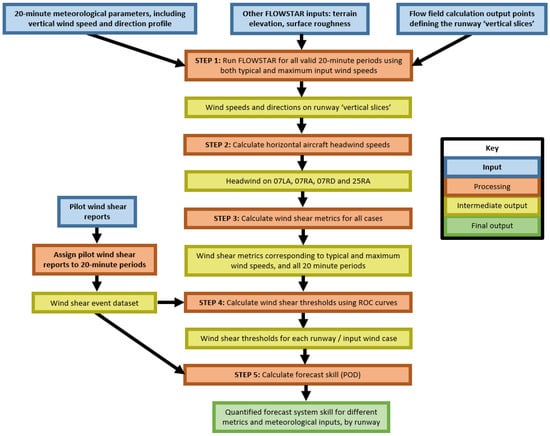 The now-casting system structure comprises a series of data-processing tasks, labelled as steps 1 to 3 in the system flow chart (Figure 3). The evaluation process whereby the now-casting system wind-shear outputs are compared to the pilot wind-shear event dataset are described in steps 4 and 5; the methodology for generating the wind-shear event dataset required as input to steps 4 and 5 is described earlier (Section 2.1).