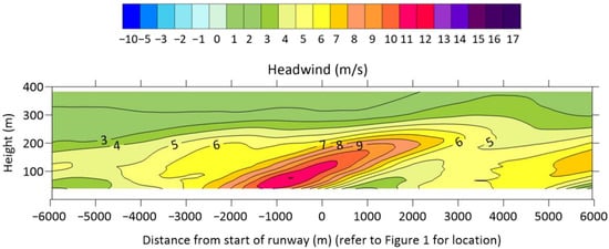 where  is the total change of wind along the glide path,  is the ramp length, and  is the normal approach speed of the aircraft. The wind-shear ramp length is the distance over which there is a sustained change in headwind corresponding to the wind-shear event. The earliest FLOWSTAR studies modelling wind shear along an aircraft trajectory [,] demonstrated that the model was able to predict the sharp changes in headwind that cause adverse wind shear. A subsequent study [] derived observed and modelled headwind gradients along the flight path in an attempt to distinguish between favourable and unfavourable landing conditions; these headwind gradients broadly correspond to  using the notation from (*). This work highlighted that sharp headwind gradients may relate to flow structures that can be identified by consideration of 2D vertical headwind slices (Figure 4). The current study involved automating the calculations of not only horizontal headwind gradients but also corresponding vertical gradients; an indication of how horizontal and vertical gradients are calculated is given in Figure 4 adjacent to a modelled complex-flow structure.