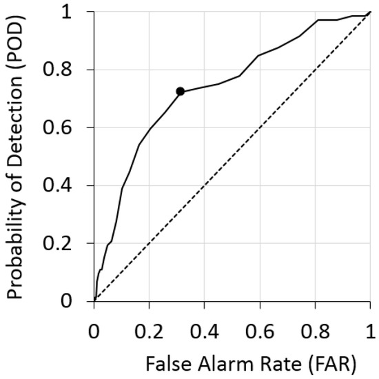 An ROC curve quantifies how the number of correctly modelled events relates to the magnitude of the threshold that can be used to detect events. An example is shown in Figure 5, with the POD and FAR values shown on the vertical and horizontal axes, respectively. The graph starts at (0,0) because if the threshold is set to zero, no events are detected correctly (POD = 0), but no events are incorrectly detected, either (FAR = 0). The graph ends when all events have been detected (POD = 1, FAR ≤ 1). Now-casts with better skill have ROC curves with vertical gradients that are much greater than unity, with the point farthest from the FAR = POD line indicating parameters that maximise POD for low values of FAR, ensuring that POD must be greater than FAR (black dot in Figure 5); these parameters can be identified through calculation of the product of POD  (1 − FAR)  (POD − FAR), with the last term in this expression ensuring that this metric identifies the maximum positive distance between the 1:1 line and the ROC curve. For this study, parameters identified using this methodology were used to define thresholds for assessing now-cast accuracy in terms of POD for all metrics and runways.