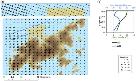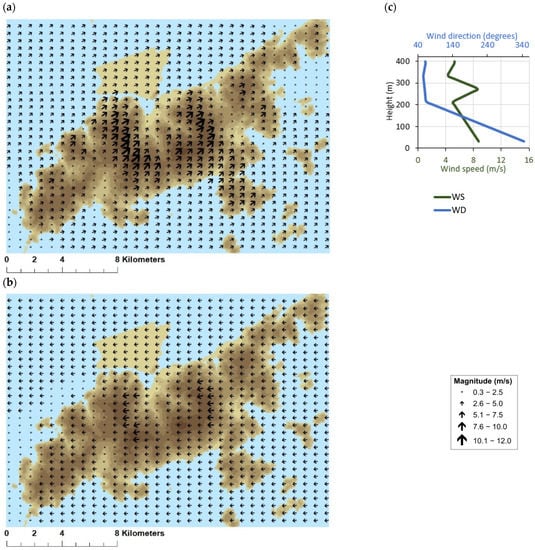 Figure 8 presents the same series of plots for a very different headwind pattern. Here, the flow structure was dominated by the vertical wind shear generated by the upwind profile (refer to the wind barbs on Figure 8b). Wind magnitudes were smaller than in the previous case and the wind directions ranged from 160° to 345° below 150 m, leading to tailwinds. Figure 9a,b shows synoptic winds corresponding to 100 m and 200 m above ground, respectively, and a strong directional shear as well as a decrease in wind speed with height was demonstrated (shown in the wind barbs on Figure 8b). Also of note in these plots is that high wind magnitudes corresponded closely to terrain elevation, without the additional off-shore flow structures seen in the trapped-wave case. In terms of the wind-shear metrics, the vertical-acceleration parameters presented in Figure 8a showed symmetry between the minimum and maximum values, and magnitudes of both parameters were greater than in Figure 7. Conversely, the horizontal-acceleration metrics were considerably smaller in magnitude than the corresponding trapped-wave case because headwind values varied little with distance along the runway (Figure 8c).