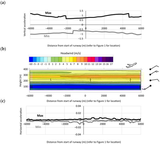 Figure 6 and Figure 8a,c present examples of how the minimum and maximum horizontal- and vertical-acceleration parameters varied with horizontal distance along the vertical slices. The acceleration-metric quantities (Table 2) were the maximum or minimum of these values, and a further metric considered was the maximum absolute value of either of these metrics. An additional set of metrics was taken as the magnitudes of the headwind values at the locations of the acceleration metric quantities and, finally, the maximum absolute value of these parameters.