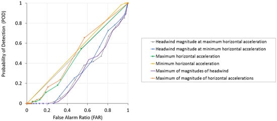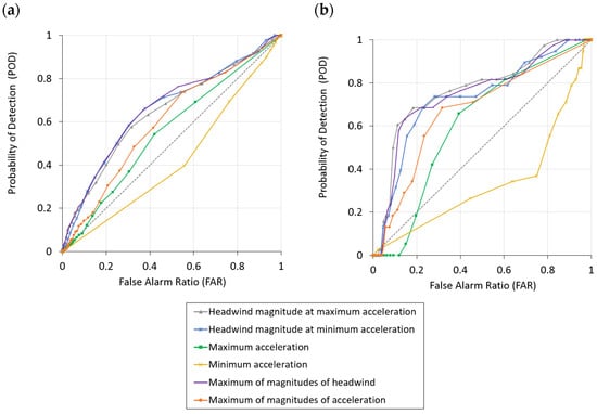 Acceleration and headwind metrics (Table 2) were calculated and used to generate ROC curves and hence the relative skill of each type of metric assessed. Figure 10 presents two example sets of ROC curves; Figure 10a presents a maximum wind speed in a horizontal-acceleration case, and Figure 10b presents the results for a typical wind speed in a vertical-acceleration case. Here, as for the majority of the ROC curves generated, the skill of the headwind metrics that relate to the location of the maximum and minimum values of the acceleration were better than the skill of the underlying acceleration parameter. Only the headwind metrics were evaluated in subsequent analyses due to their better performance. The inter-comparison of Figure 10a,b also suggests that the vertical-acceleration parameters performed better that the horizontal parameters, but this is not true when comparing results from the same runway corridors.