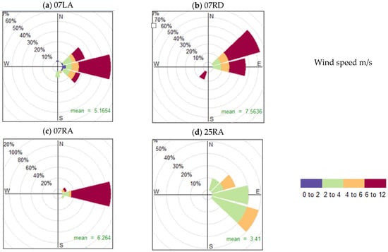 Wind roses for wind-shear cases associated with the four runway corridors: (a) 07LA, (b) 07RD, (c) 07RA, and (d) 25RA; percentage of cases shown radially, and colurs indicate wind-speed band (plots generated using the openair package [] within R software []).