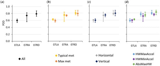 Modelled minimum, maximum, and average probability-of-detection ranges for each runway, including variations with meteorological inputs and metrics: (a) overall, (b) binned according to typical and maximum wind-speed inputs, (c) binned according to horizontal- or vertical-acceleration metric type, and (d) binned according to headwind-metric type.