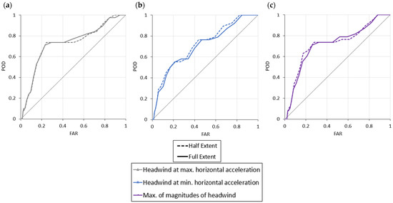 Sensitivity testing of receiver operating characteristic curves for the 3 metrics to horizontal extent for the 07RA typical wind-speed horizontal-acceleration case using half the horizontal extent of the runway (−6000 to 0) and the full horizontal extent of the runway (−6000 to +6000): (a) headwind at the maximum horizontal acceleration, (b) headwind at the minimum horizontal acceleration, and (c) maximum of the aforementioned headwinds.