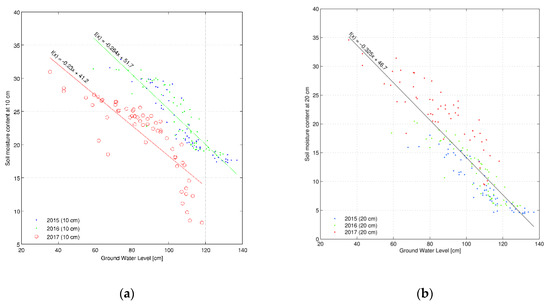 The elaborated soil moisture content measurements at consecutive depths (10, 20, 30 and 40 cm) along with the ground water table observations facilitated in establishing relationships between those parameters (Figure 8a–d). Taking into account the relationship established for the depth of 10 cm (Figure 8a) for the years 2015–2016, the range of moisture content and ground water table changes was nearly identical. In the case of 2017, considerably higher precipitation (Table 2) but similar ground water table depths generated substantially lower (by around 10%) moisture contents at that depth as compared to previous years. In the case of other analysed depths (20, 30 and 40 cm, Figure 8b–d), the measurement points of 2015 and 2016 were close to one another. The data in 2017 had slightly higher values (on account of the diverse meteorological conditions); nonetheless, they fit in the previous linear trend of established relationships. The advantage of the obtained linear equations is the feasibility to describe average and wet soil water conditions.