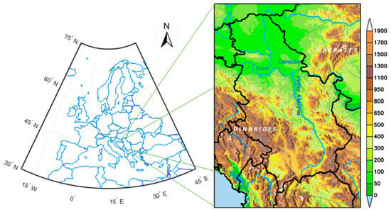 Serbia is continental country located on the Balkan Peninsula, in the southeast of Europe, within the temperate climate zone between latitudes 41°50′ and 46°10′ N (Figure 1). Its relief gradually changes from northern part with flat and low elevation terrain situated within Pannonian plain, toward central and southern part which is covered by hills and mountains surrounding river valleys. The climate varies from moderate continental in northern part to continental in central part and modified Mediterranean in southern and southwestern part due to Mediterranean influence which is modified because the Dinaric Mountain range (that stretches through the west and southwest of the country) prevent humid air masses to move in from west [,]. The mean annual temperature varies between 3 °C in regions with altitude above 1500 m and 12 °C in the lowlands. The mean annual rainfall increases with altitude: 600 mm in northern region and between 800 mm and 1000 mm in the mountainous region [].