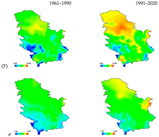 Like a mean temperature, a standard deviation increased in Serbia in the second considered period (1991–2020). A standard deviation in value of 8 °C prevailed in Serbia during the period 1961–1990. The lowest values (7.5 °C) are recorded in southwestern Serbia, while the highest one at the far east (Figure 2). During the second period (1991–2020), values of standard deviation were above 8 °C in the wider Belgrade area and northern Serbia, with the highest values above 9 °C at the far east of Serbia (Figure 2).