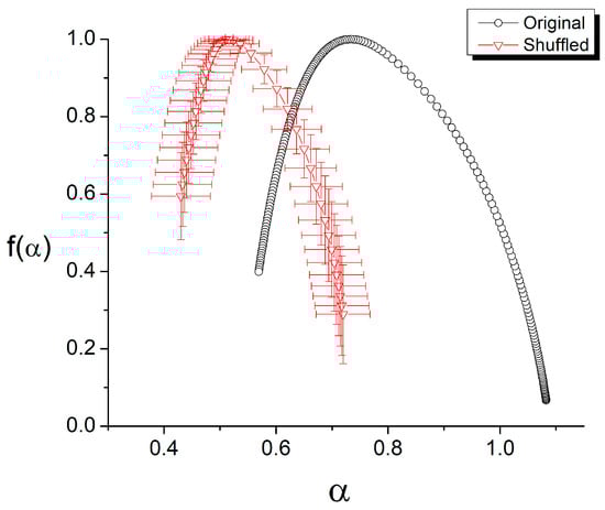 Multifractal spectra for the original and the shuffled anomaly series for a sample grid point at latitude 44.15 and longitude 21.35, corresponding to the central Serbia region close to the city of Kragujevac. The shuffled spectra correspond to mean values for 100 surrogate shuffled series, and the error bars to plus minus two standard deviations (the q parameter resolution was reduced here Δq = 0.5 for better visualization).