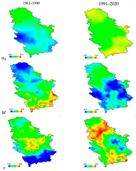 Multifractal properties of air temperature were also found in other regions in world [,,]. It is worth to compare our results with those of Da Silva et al. []. They applied MFDFA on daily temperature series recorded in 265 stations in Brazil during the period from 1990 to 2017. They found that all series showed multifractal properties with persistent long-term correlations and the dominance of large fluctuations. In southern region with higher elevation the temperature fluctuations display weaker persistency (lower values) and stronger multifractality (larger width W of multifractal spectrum). It is qualitatively similar as obtained for temperature series for Serbia in both considered periods: dominance of small fluctuations (right skewed spectrum) and weaker persistence (lower values) in mountainous regions.