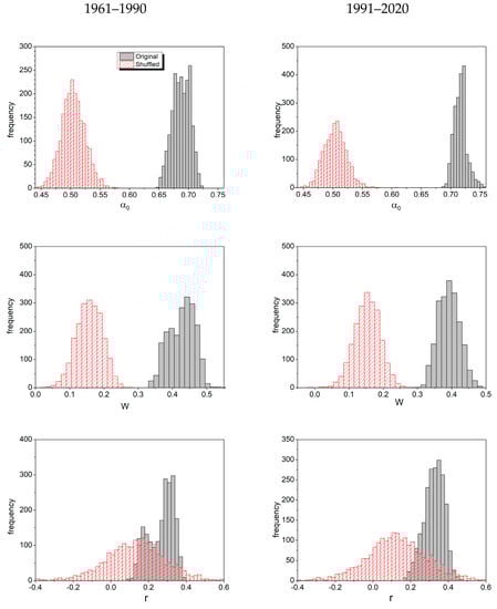 Histograms of the multifractal spectrum parameters: position of maximum α0 (top row), spectrum width W (middle row), and skew parameter r (bottom row) of daily temperature series for the two considered periods: 1961–1990 (left column) and 1991–2020 (right column).