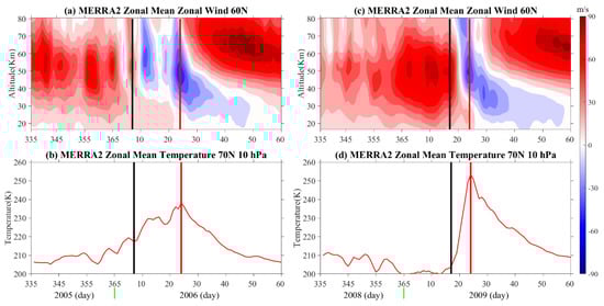 Temporal variations of the (a,c) zonal mean zonal wind at 60° N and (b,d) zonal mean temperature at 70° N and 10 hPa in (a,b) 2006 and (c,d) 2009. The vertical black and red lines indicate the starting of the sudden stratospheric warming and the warming peak of the sudden stratospheric warming.
