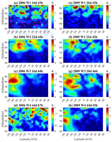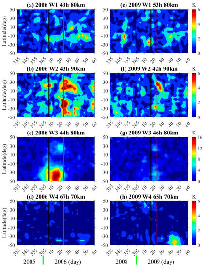 The temperature spatial structures of W1, W2, W3, and W4 in 2006 and 2009 are shown in the panels of Figure 4, respectively. In the temperature spatial structure of 2006 shown in Figure 4a–d, W1 reaches its maximum amplitude at ~10–20° S and ~82 km, which is ~3 K with fixed ~43 h on days 16–22. The temperature amplitude of W2 is ~8 K with fixed ~44 h on days 22–28 at ~20–30° S and ~88 km. The temperature amplitude of W3 is ~17 K with fixed ~44 h on days 16–22 at ~30–40° S and ~82 km, and there is a peak amplitude of ~11 K at ~70 km. The maximum amplitude of W4 is ~2 K with a fixed ~67 h on days 44–50 in the ~30–40° S and 70 km. In the temperature spatial structure of 2009 shown in Figure 4e–h, W1 reaches its maximum amplitude at ~10–20° S and ~90 km, which is ~5 K with fixed ~43 h on days 26–32. The temperature amplitude of W2 is ~7 K with fixed ~42 h on days 22–28 at ~20–30° S and ~90 km. The temperature amplitude of W3 is ~6 K with fixed ~46 h on days 20–26 at ~30–40° S and ~82 km, and there is a peak amplitude of ~6 K at ~60 km. The temperature amplitude of W4 is ~6 K with fixed ~65 h on days 44–50 at ~30–40° S and ~70 km, and there is a peak of ~5 K at ~80 km. The amplitude of the temperature spatial structure of W2 and W3 in 2006 SSW was stronger than that in the 2009 SSW. However, the temperature amplitude of W4 in the 2006 SSW was weaker than in the 2009 SSW.