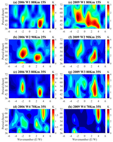 The spectral structure of temperature is shown in Figure 3. Figure 3a,e shows the maximum W1 amplitudes at ~80 km and ~15° S of SABER temperature at 16–22 and 26–32 days in 2006 and 2009, respectively. A westward wavenumber 1 signal is found at ~43 h (~3 K) and ~44 h (~3 K), respectively. In addition, Figure 3a also contains the strongest signal with a westward wavenumber of 3 (~8 K, ~43 h). Figure 3b,d shows the maximum amplitude of W2 at ~90 km and ~25° S on 22–28 and 22–28 days between 2006 and 2009, respectively. A westward wavenumber 2 signal is fixed at ~44 h (~6 K) and ~42 h (~6 K), respectively. In addition, there is also the strongest signal with an eastward wavenumber of −2 (~7 K, ~49 h) in Figure 3b and a westward wavenumber of 3 (~6 K, ~47 h) in Figure 3f. Figure 3c,g shows the maximum W3 at ~80 km and ~35° S on days 16–22 and 20–26 during 2006 and 2009, respectively. A westward wavenumber 3 signal is fixed at ~44 h (~13 K) and ~46 h (~4 K), respectively. In addition, Figure 3c also contains the strongest signal with an eastward wavenumber of −2 (~11 K, 51 h). Figure 3d,h shows the maximum W4 at ~70 km and ~35° S on 44–50 days and 44–50 days during 2006 and 2009, respectively. A westward wavenumber of 4 is fixed at ~67 h (~2 K) and ~65 h (~4 K), respectively.