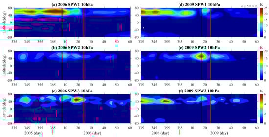 Temporal and latitude variations of the stationary planetary wave with wavenumber 1 (SPW1), 2 (SPW2), and 3 (SPW3) at 10 hPa in 2006 (a–c) and 2009 (d–f). The vertical black and red lines indicate the starting of the sudden stratospheric warming and the warming peak of the sudden stratospheric warming.