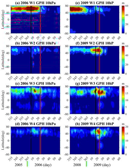 Temporal and latitude variation of the GPH in 2006 (a–d) and 2009 (e–h). The vertical black and red lines indicate the starting of the sudden stratospheric warming and the warming peak of the sudden stratospheric warming.