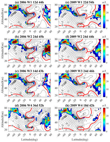 Temporal and latitude variation of the W1, W2, W3, and W4 during 2006 (a–d) and 2009 (e–h). The vertical black and red lines indicate the starting of the sudden stratospheric warming and the warming peak of the sudden stratospheric warming.