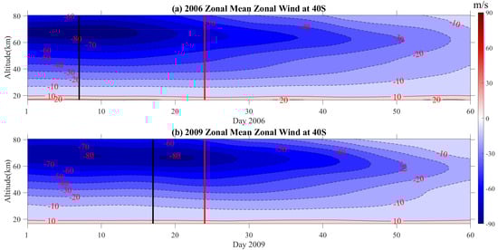 Temporal and altitude variations of the zonal mean zonal wind at 40° S in (a) 2006 and (b) 2009. The vertical black and red lines indicate the starting of the sudden stratospheric warming and the warming peak of the sudden stratospheric warming.